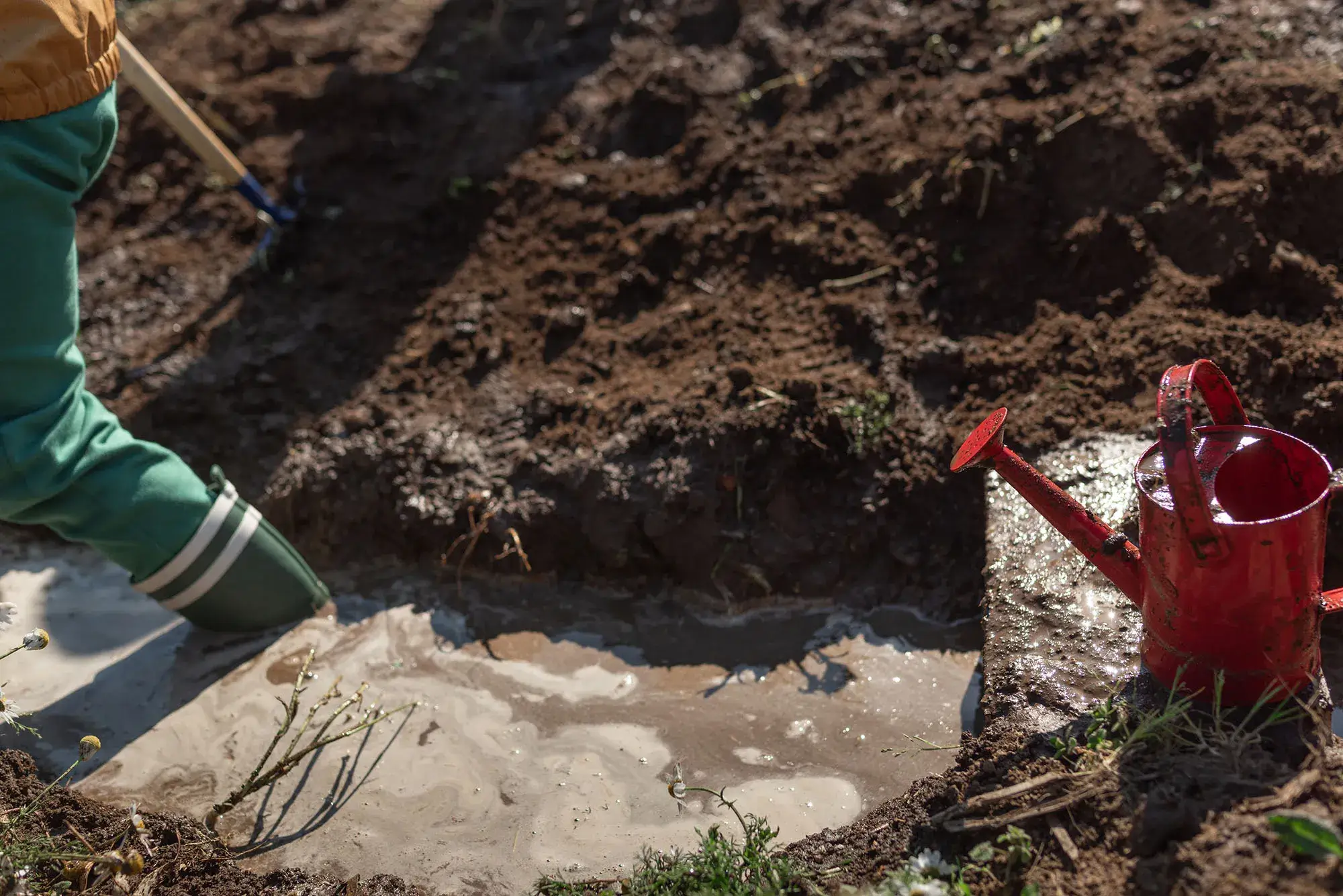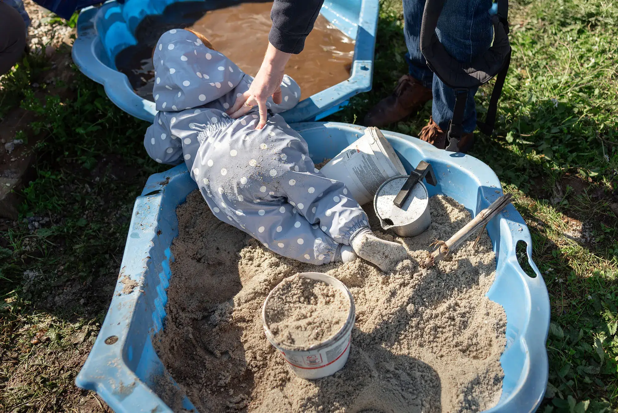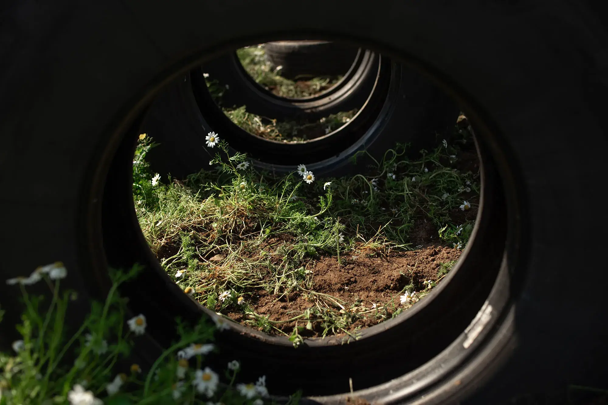 A nossa filosofia prioriza materiais naturais. A terra, os paus e as folhas são as estrelas, mesmo que uma pá ou um balde de plástico nos ajude na missão.